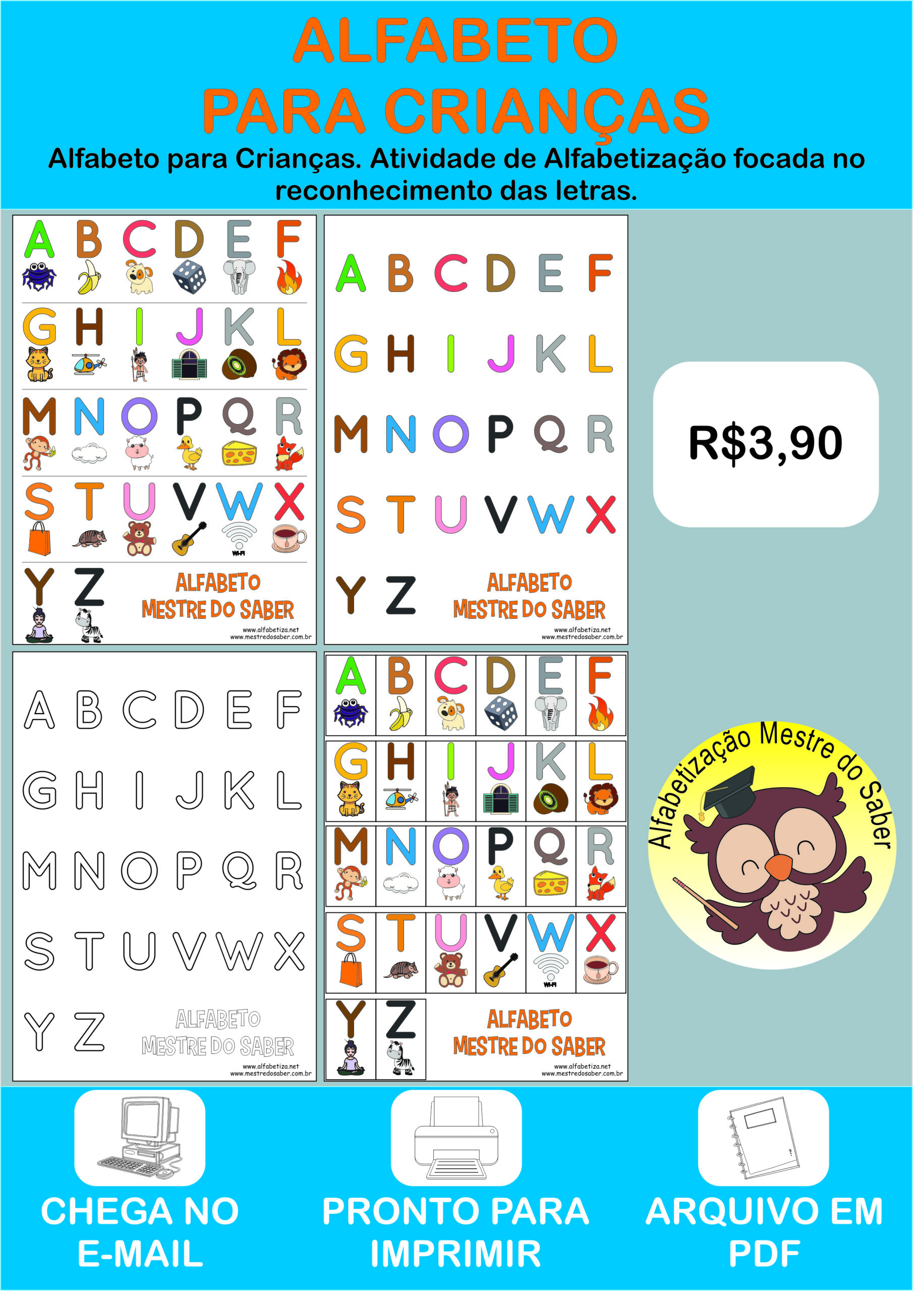 Alfabeto para Crianças para imprimir. Quatro (4) páginas elaboradas para ensinar o alfabeto para crianças que estão no processo de alfabetização.