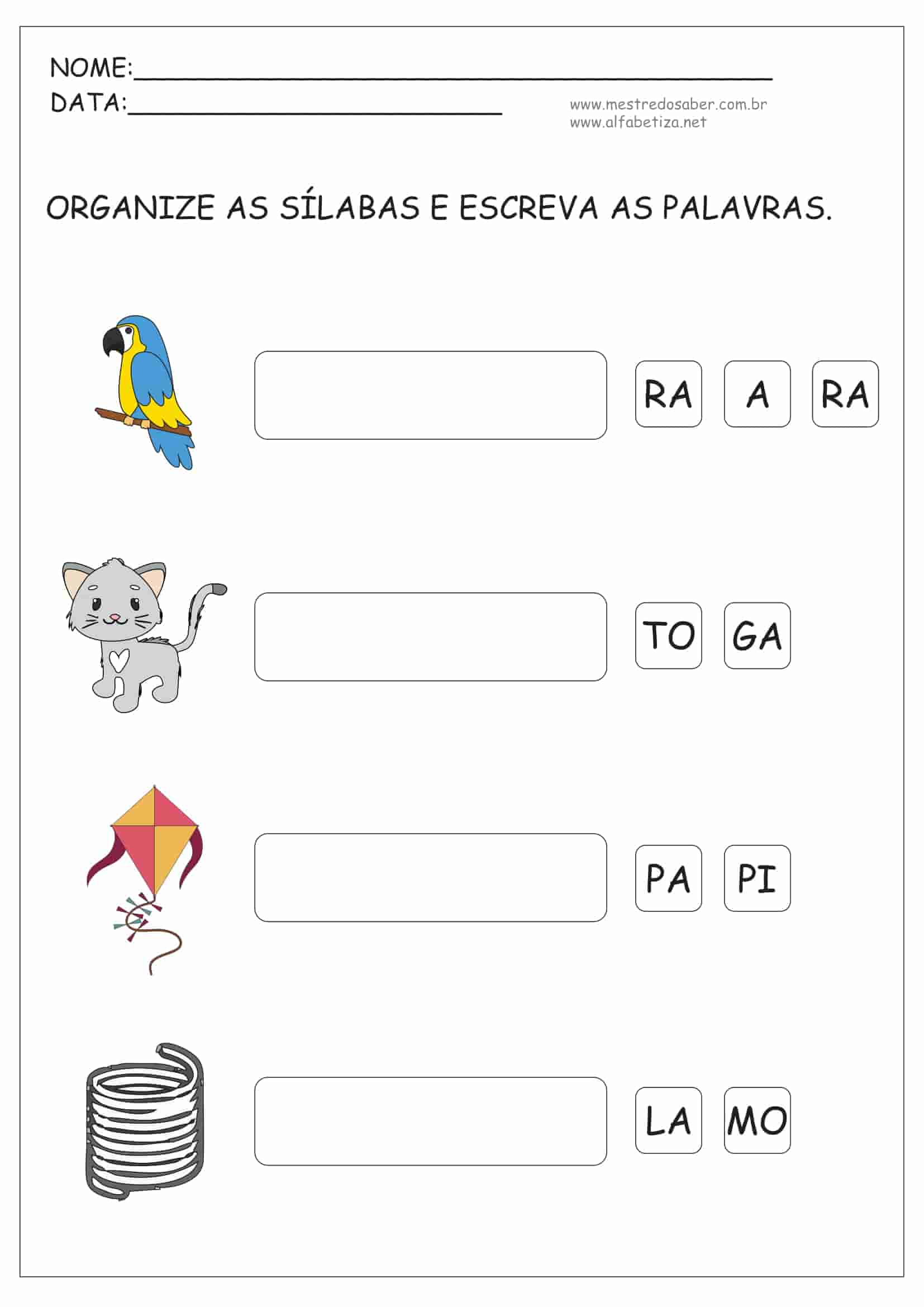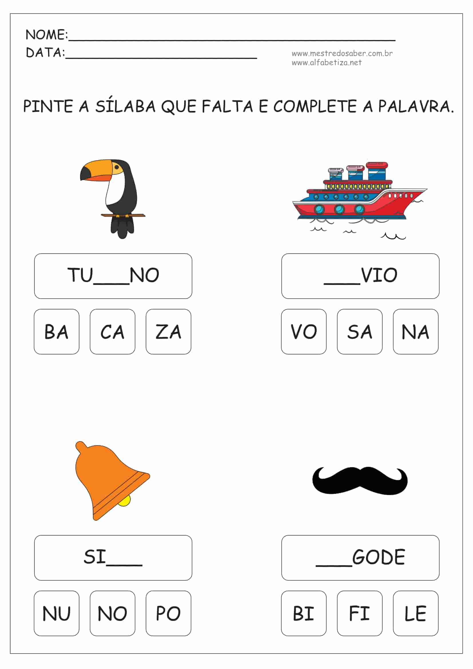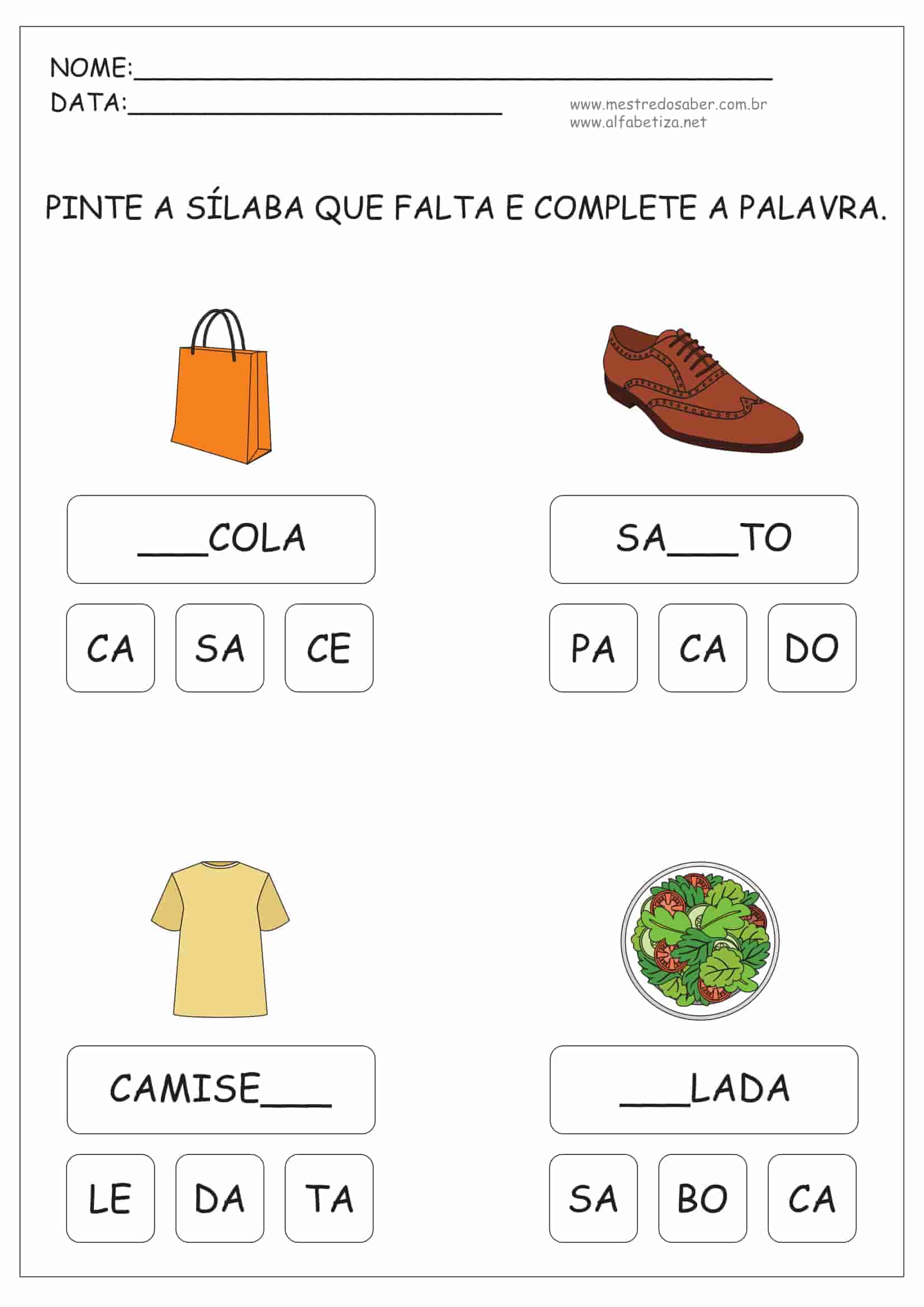 10 (dez) Atividades de Alfabetização Sílabas para alunos do final da educação infantil e 1º ano e 2º ano do ensino fundamental I prontas para imprimir.